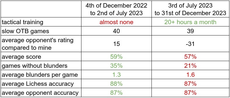So I sat down, analysed 80 of my OTB games (half of them before I started my intensive tactical training and half after starting it) and compiled the following table: