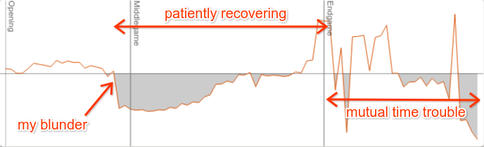 b5 followed from my opponent and I was losing a piece. I could have only chosen if I preferred to lose my bishop or my rook. (Bizarrely, owing to working very hard on this game and slowly improving my position, I managed to equalise about 20 moves later and even got a winning position which I finally wasted due to being in time trouble.) The following lichess move by move evaluation graph shows the progress of that game: